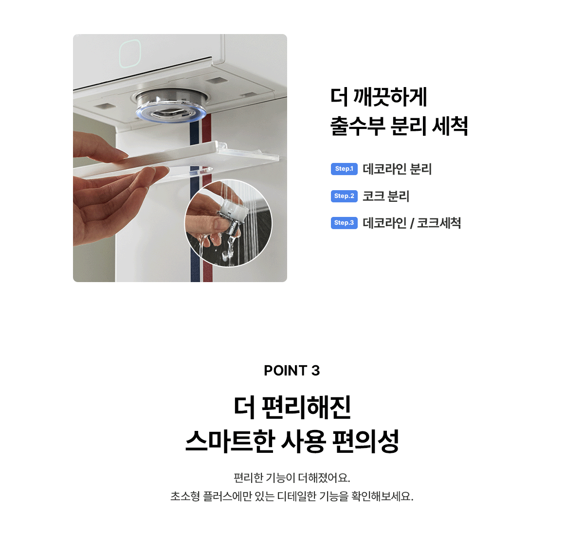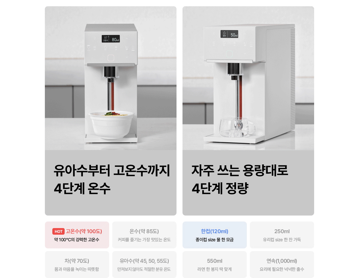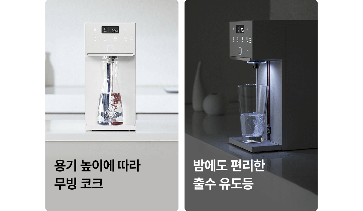가장 만족스러운 점은 공간을 거의 차지하지 않는다는 거예요. 작은 주방에도 부담 없이 설치할수 있어서 인테리어에도 잘 어울리고요. 냉수,온수 둘 다 직수로 나와서 물맛도 깔끔하고 위생적으로 느껴집니다. 특히 뜨거운 물이 빠르게 나와서 아침에 커피 마시거나 분유 타야 할때 정말 유용해요. 온도 조절 기능도 직관적이고요.