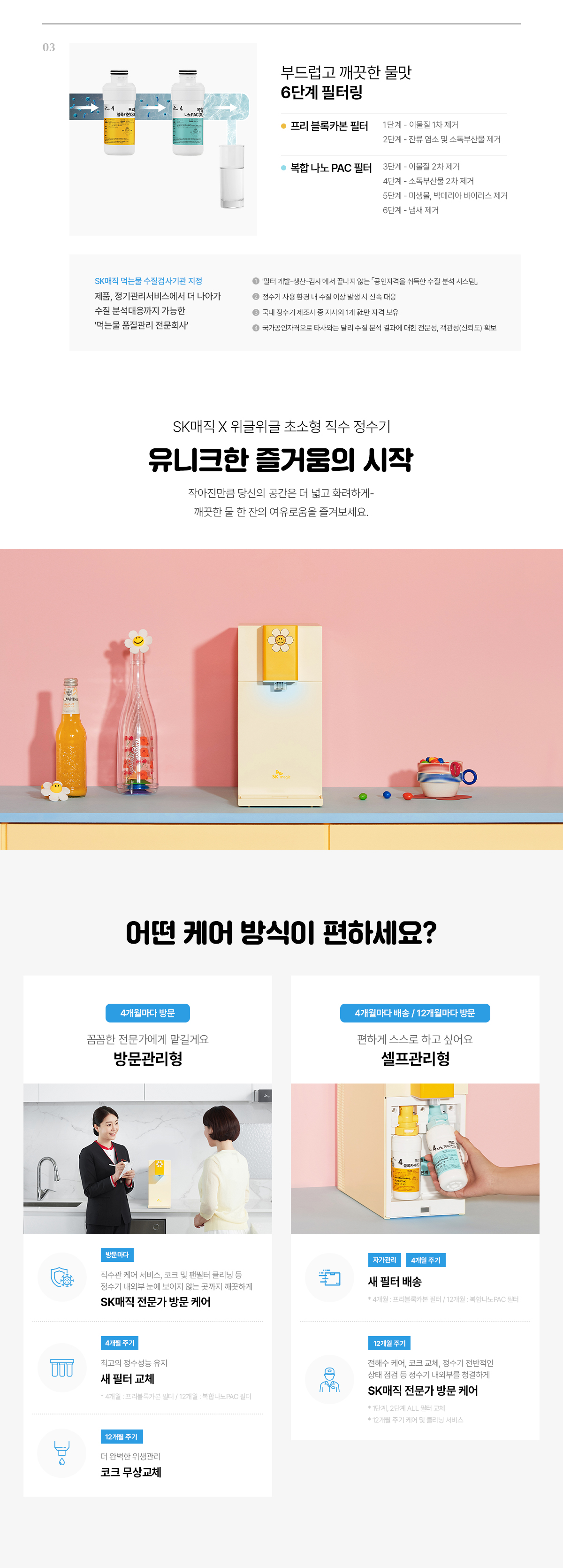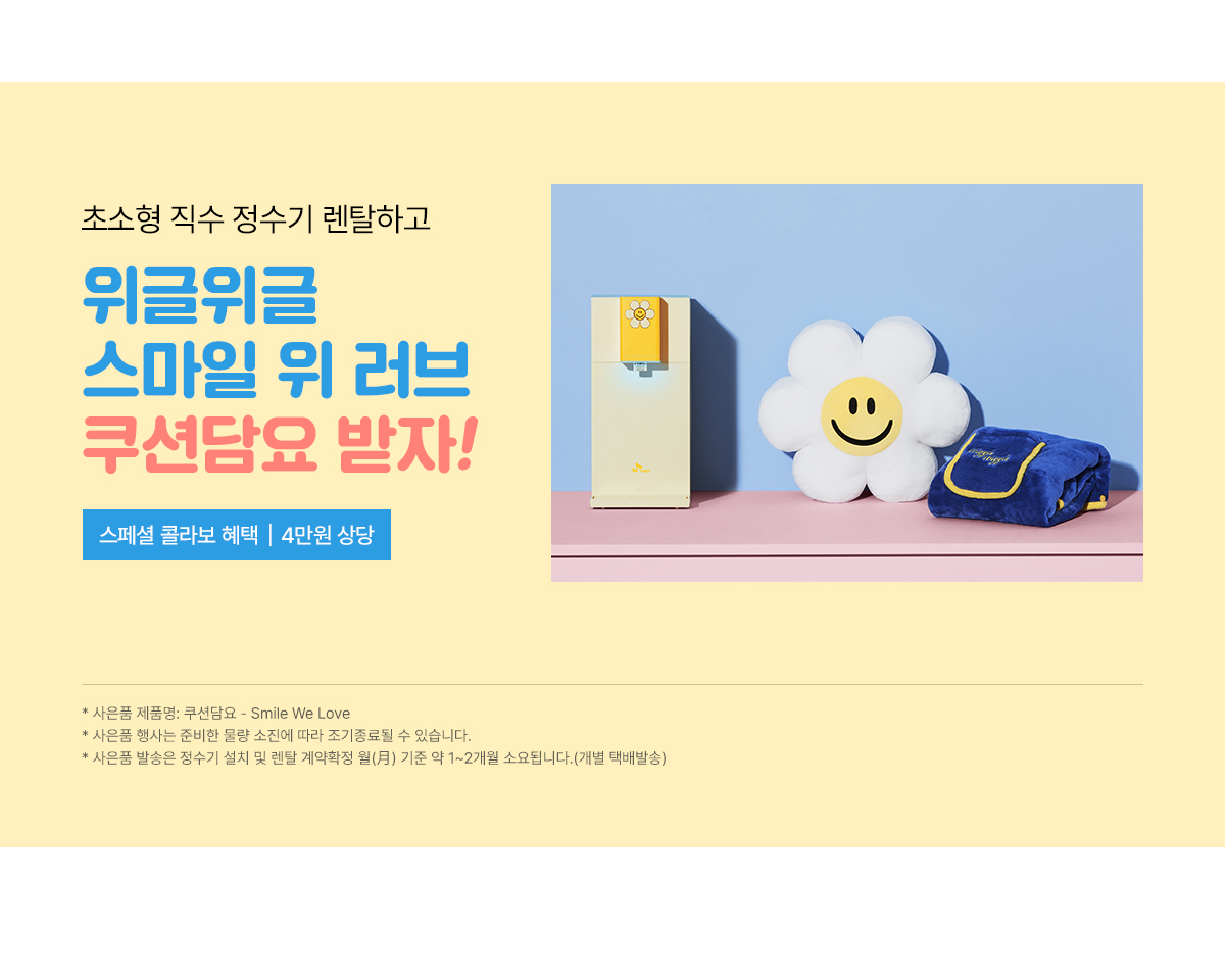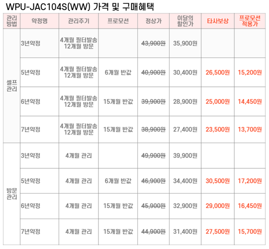 WPU-JAC104S(WW) SK매직 [SK매직] 초소형 직수 정수기 위글위글 제품분류 냉/온정수기 정수방식 직수형 기능 냉온전용 A/S기간 렌탈기간내 최저 렌탈가 월 23,500 (렌탈가) 제휴카드 할인가 월 (렌탈가) 3년 5년 6년 7년 셀프관리 방문관리/4개월 셀프관리(타사보상) 방문관리/4개월(타사보상) 위글 옐로우 SK반값할인 할인 제휴카드 보기 렌탈신청 장바구니