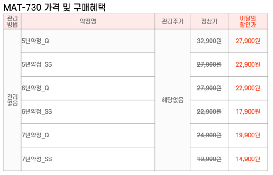 MAT-SM730,MAT-QM730 SK매직 [SK매직] 워커힐 스탠다드 매트리스(슈퍼싱글,퀸) 제품분류 매트리스 A/S기간 렌탈기간내 최저 렌탈가 월 14,900 (렌탈가) 제휴카드 할인가 월 (렌탈가) 5년 6년 7년 슈퍼싱글 퀸 할인 제휴카드 보기 렌탈신청 장바구니