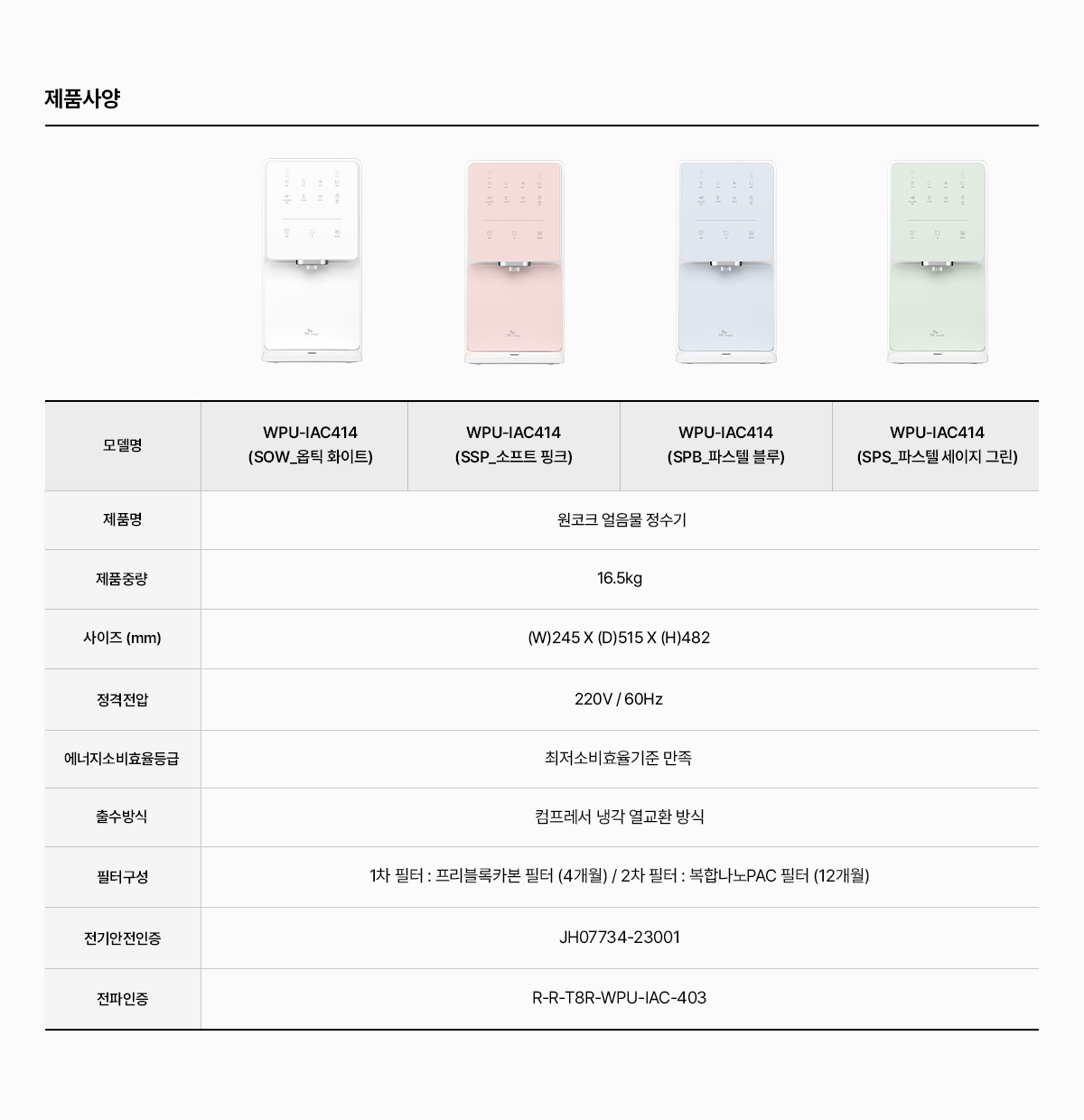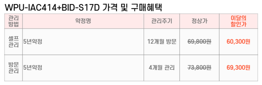 WPU-IAC414+BID-S17D SK매직 [SK매직] 원코크 얼음물 직수 얼음 냉온정수기 + 풀스텐 살균 비데 제품분류 정수기패키지 비데패키지 A/S기간 렌탈기간내 최저 렌탈가 월 60,300 (렌탈가) 제휴카드 할인가 월 (렌탈가) 5년 셀프관리 방문관리/4개월 옵틱화이트 파스텔세이지 소프트핑크 파스텔블루 할인 제휴카드 보기 렌탈신청 장바구니