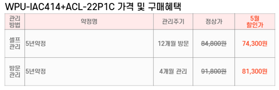 WPU-IAC414+ACL-22P1C SK매직 [SK매직] 원코크 얼음물 직수얼음 정수기 + 올클린 디아트 펫 공기청정기 22평형 제품분류 정수기패키지 공기청정기패키지 A/S기간 렌탈기간내 최저 렌탈가 월 74,300 (렌탈가) 제휴카드 할인가 월 (렌탈가) 5년 셀프관리 방문관리/4개월 옵틱화이트 파스텔세이지 소프트핑크 파스텔블루 할인 제휴카드 보기 렌탈신청 장바구니