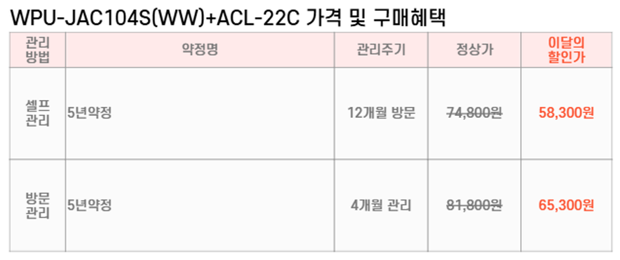 WPU-JAC104S(WW)+ACL-22C SK매직 [SK매직] 초소형 직수 정수기 위글위글 + 올클린 디아트 공기청정기 22평형 제품분류 정수기패키지 공기청정기패키지 A/S기간 렌탈기간내 최저 렌탈가 월 58,300 (렌탈가) 제휴카드 할인가 월 (렌탈가) 5년 셀프관리 방문관리/4개월 오트밀베이지 다크그린 할인 제휴카드 보기 렌탈신청 장바구니