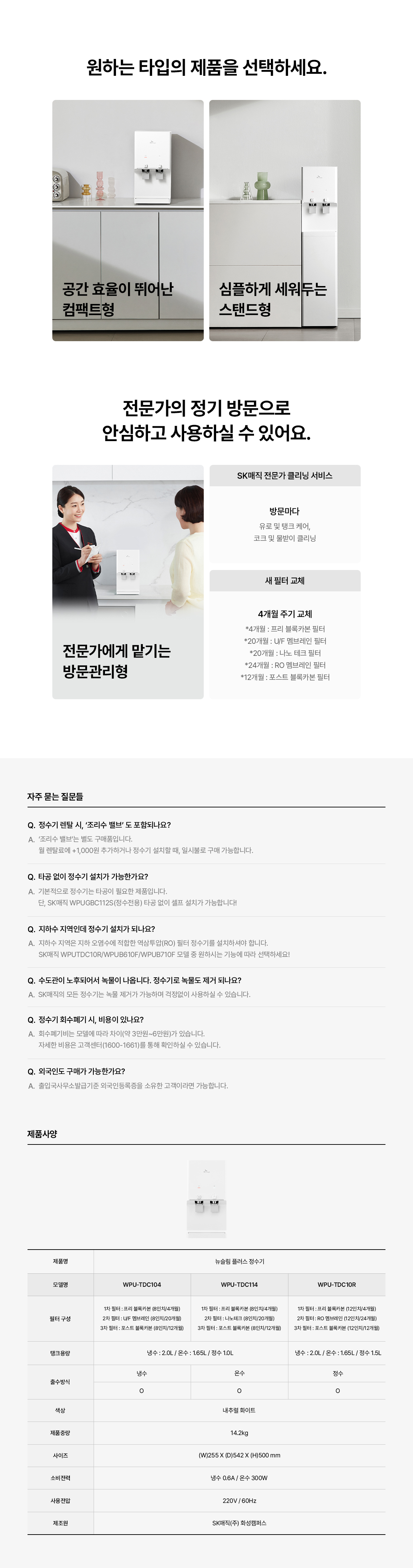 WPU-TDC104 SK매직 [SK매직] 뉴슬림 플러스 정수기 제품분류 냉/온정수기 정수방식 탱크형 기능 냉온전용 A/S기간 렌탈기간내 최저 렌탈가 월 19,900 (렌탈가) 제휴카드 할인가 월 (렌탈가) 3년 5년 방문관리/4개월 내추럴화이트 할인 제휴카드 보기 렌탈신청 장바구니