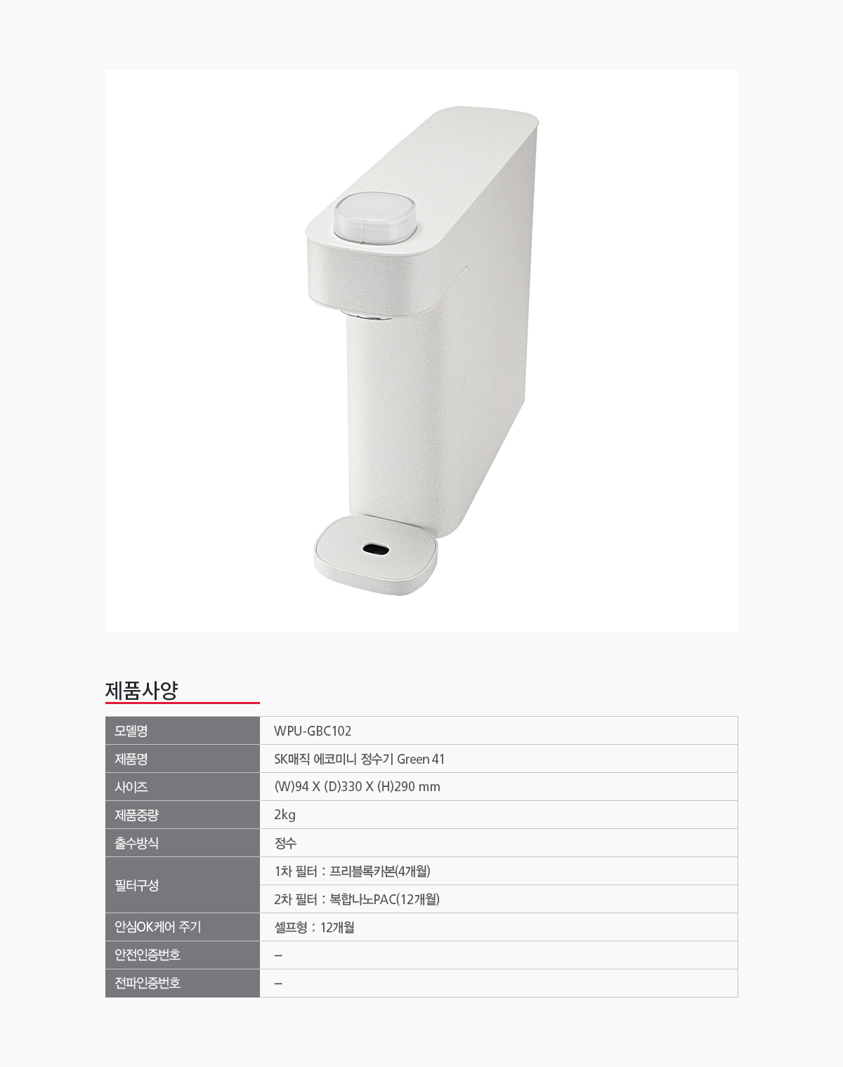WPU-GBC102S SK매직 [SK매직] 무전원 에코 미니 정수기 Green 41 제품분류 정수기 정수전용 정수방식 직수형 기능 정수전용 A/S기간 렌탈기간내 최저 렌탈가 월 15,900 (렌탈가) 제휴카드 할인가 월 (렌탈가) 3년 5년 6년 셀프관리 화이트 할인 제휴카드 보기 렌탈신청 장바구니