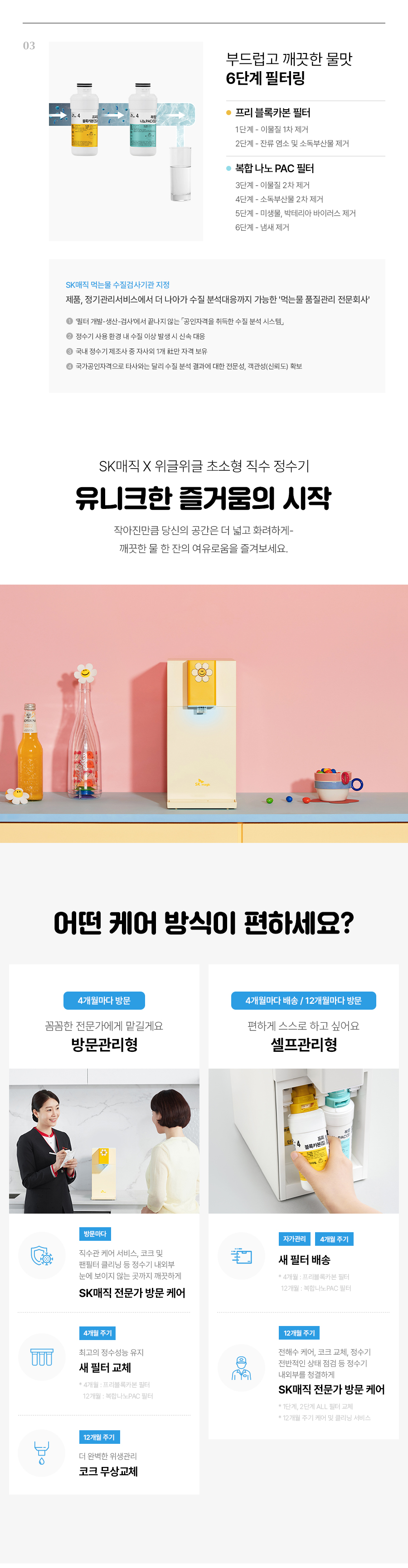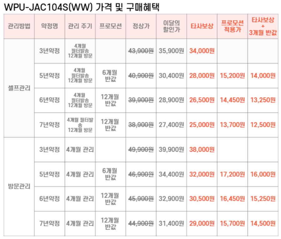 WPU-JAC104S(WW) SK매직 [SK매직] 초소형 직수 정수기 위글위글 제품분류 냉/온정수기 정수방식 직수형 기능 냉온전용 A/S기간 렌탈기간내 최저 렌탈가 월 25,000 (렌탈가) 제휴카드 할인가 월 (렌탈가) 3년 5년 6년 7년 셀프관리 방문관리/4개월 셀프관리(타사보상) 방문관리/4개월(타사보상) 위글 옐로우 SK반값할인 할인 제휴카드 보기 렌탈신청 장바구니
