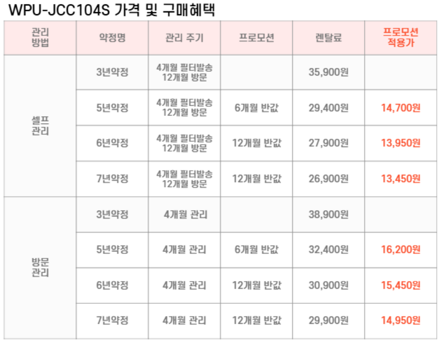 WPU-JCC104S SK매직 [SK매직] 초소형 직수 정수기 제품분류 냉정수기 정수방식 직수형 기능 냉수전용 A/S기간 렌탈기간내 최저 렌탈가 월 26,900 (렌탈가) 제휴카드 할인가 월 (렌탈가) 3년 5년 6년 7년 셀프관리 방문관리/4개월 네추럴화이트 SK반값할인 할인 제휴카드 보기 렌탈신청 장바구니