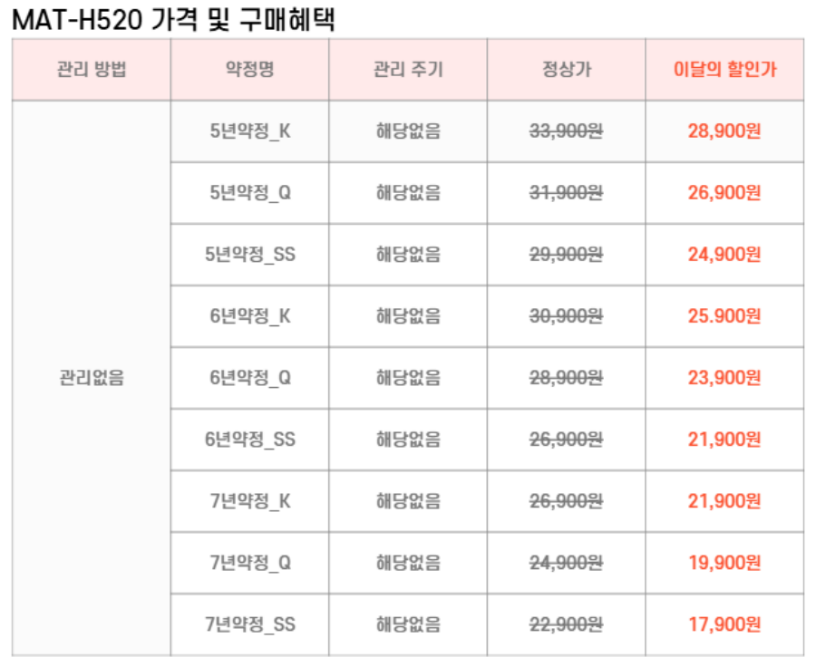 MAT-SH520,MAT-QH520,MAT-KH520 SK매직 [SK매직] 패브릭 헤드보드 프레임(슈퍼싱글,퀸,킹) 제품분류 프레임 A/S기간 렌탈기간내 최저 렌탈가 월 17,900 (렌탈가) 제휴카드 할인가 월 (렌탈가) 5년 6년 7년 슈퍼싱글 퀸 킹 할인 제휴카드 보기 렌탈신청 장바구니