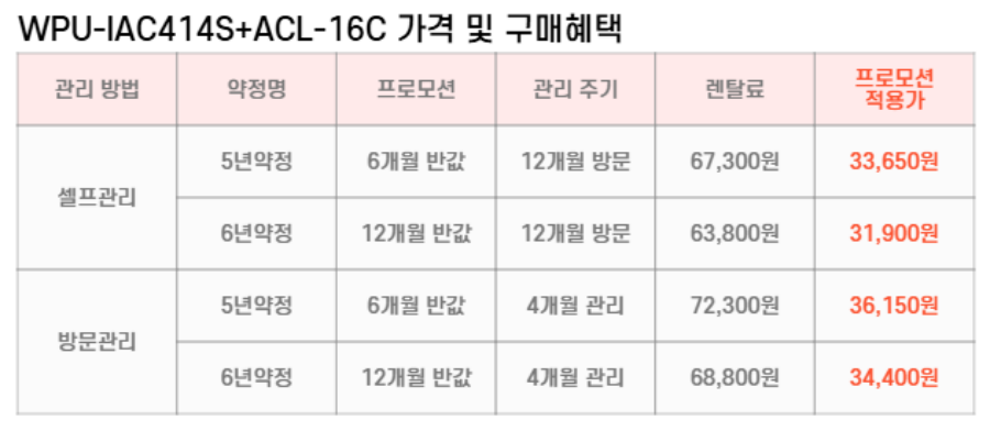 WPU-IAC414S+ACL-16C SK매직 [SK매직] 원코크 얼음물 직수 얼음 냉온정수기 + 올클린 디아트 공기청정기 16평형 제품분류 정수기패키지 공기청정기패키지 A/S기간 렌탈기간내 최저 렌탈가 월 63,800 (렌탈가) 제휴카드 할인가 월 (렌탈가) 5년 6년 자가관리 방문관리/4개월 옵틱화이트+오트밀베이지 옵틱화이트+다크그린 파스텔세이지그린+오트밀베이지 파스텔세이지그린+다크그린 파스텔블루+오트밀베이지 파스텔블루+다크그린 소프트핑크+오트밀베이지 소프트핑크+다크그린 SK반값할인 할인 제휴카드 보기 렌탈신청 장바구니